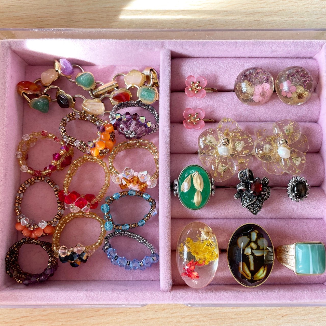 左側はおばあちゃんから貰った手作りのビーズのリングと天然石のブレスレットです。アクセサリーのほとんどがプレゼントや貰い物ばかりでどれも宝物です。